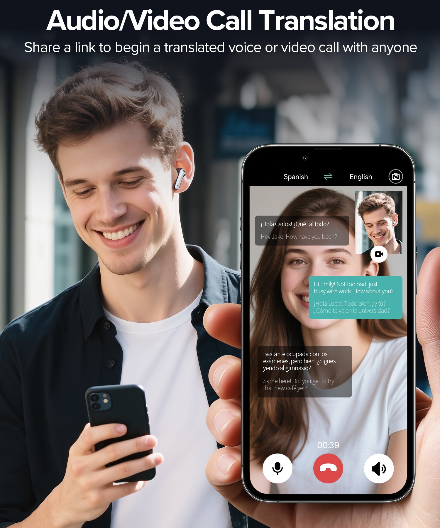 - AI Chat Mode & Audio/Video Call Translation: These translator earbuds real time feature an AI Chat Mode, allowing you to talk directly with AI for instant answers, language learning, or travel assistance. The Audio/Video Call Translation function lets you make multilingual calls by sharing a link with friends or colleagues, enabling two-way translation during voice or video conversations. Stay globally connected and communicate effortlessly through the languages translator earbuds anytime.
