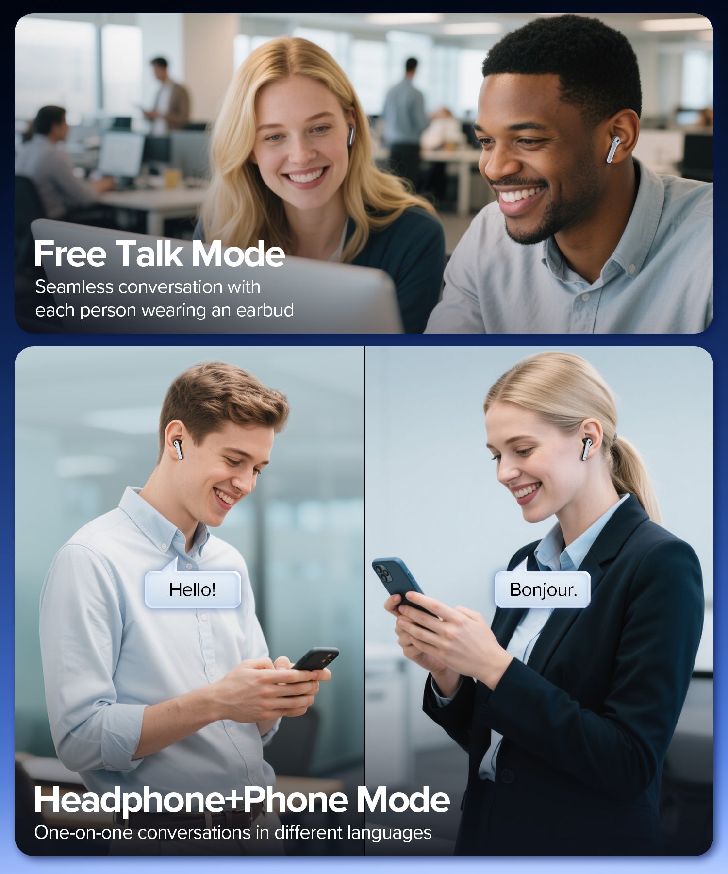 - 5 Translation Modes for Every Situation: These translation headphones are equipped with 5 translation modes to suit all communication needs: Free Talk Mode for face-to-face conversations, Headphone+Phone Mode for two-way translation, Audio/Video Call Mode for remote communication, Translation Machine Mode for single-device interaction, and Photo Translation Mode for instantly translating text from images. Enjoy barrier-free communication with these powerful ai translation earbuds real time.